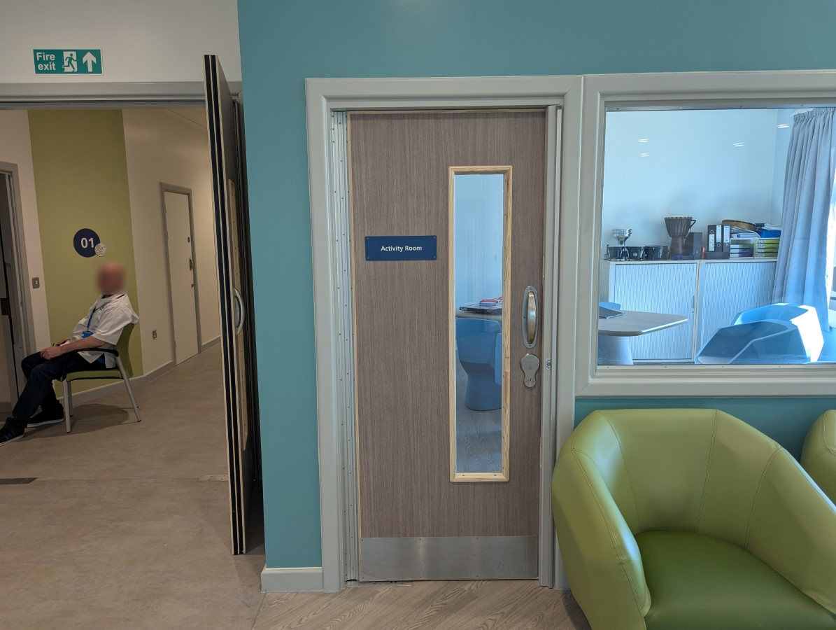 - The room is located to the left from the Fern Ward entrance through double doors to the left after the nurses office.