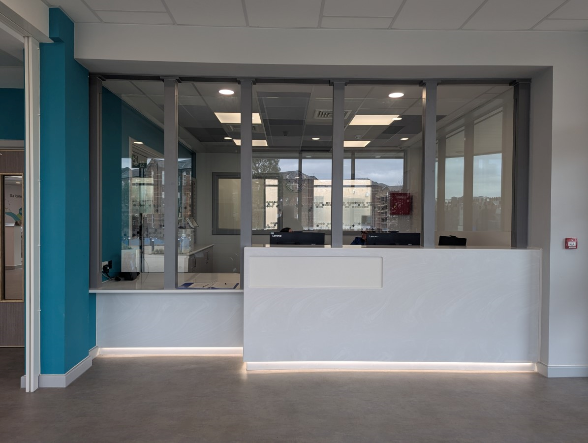 - The reception has windows and glazed screens.