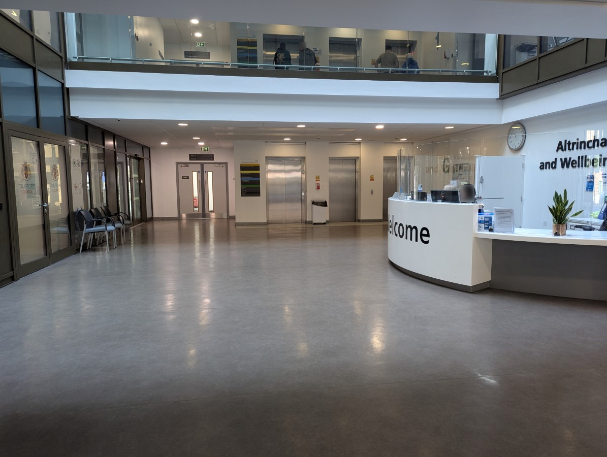 - Enter the Altrincham Health and Welling Centre via the main entrance and proceed ahead to the lifts.