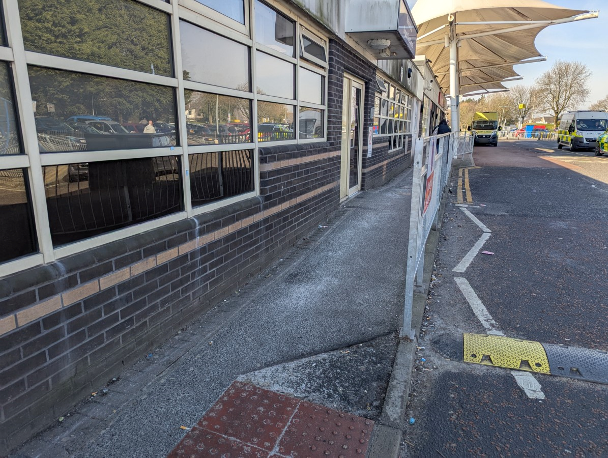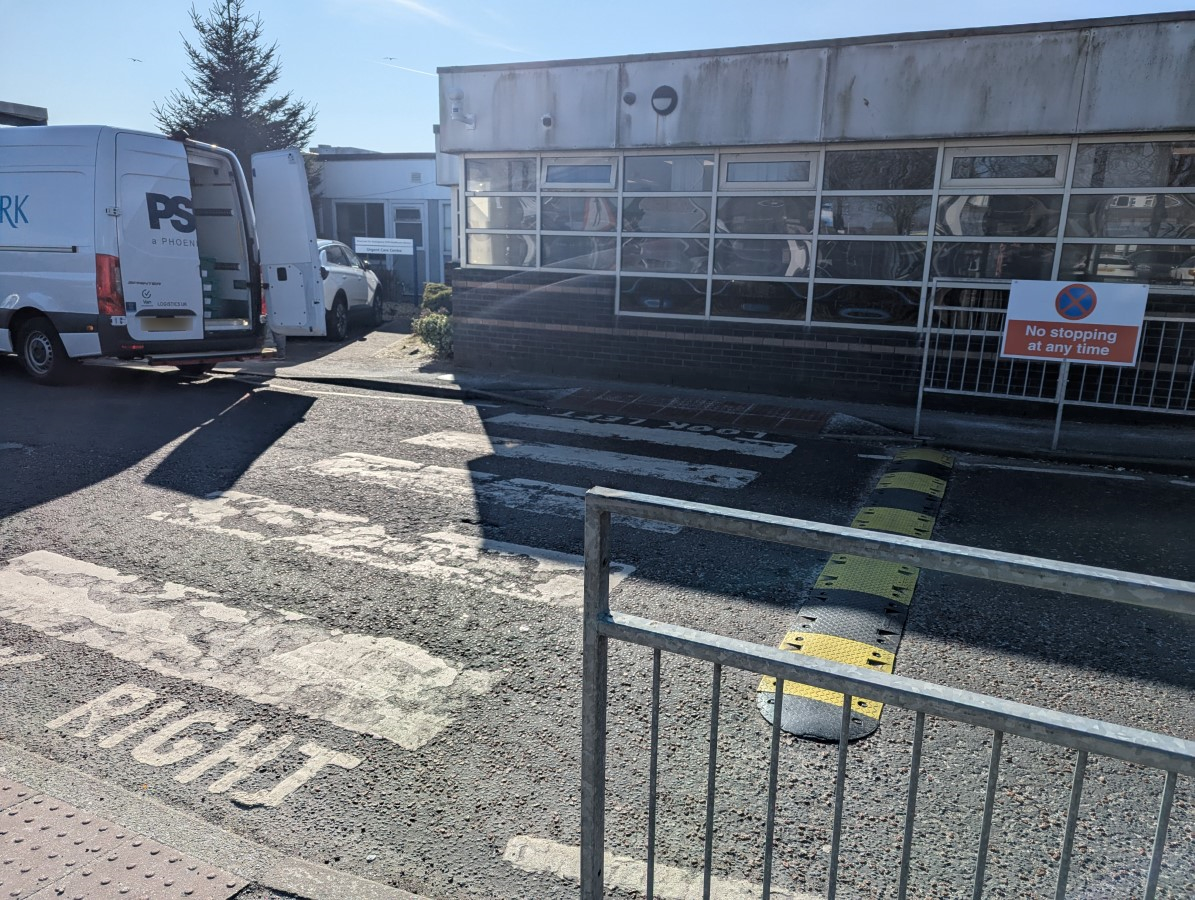 - There is a dropped kerb with tactile paving from the designated Blue Badge parking.