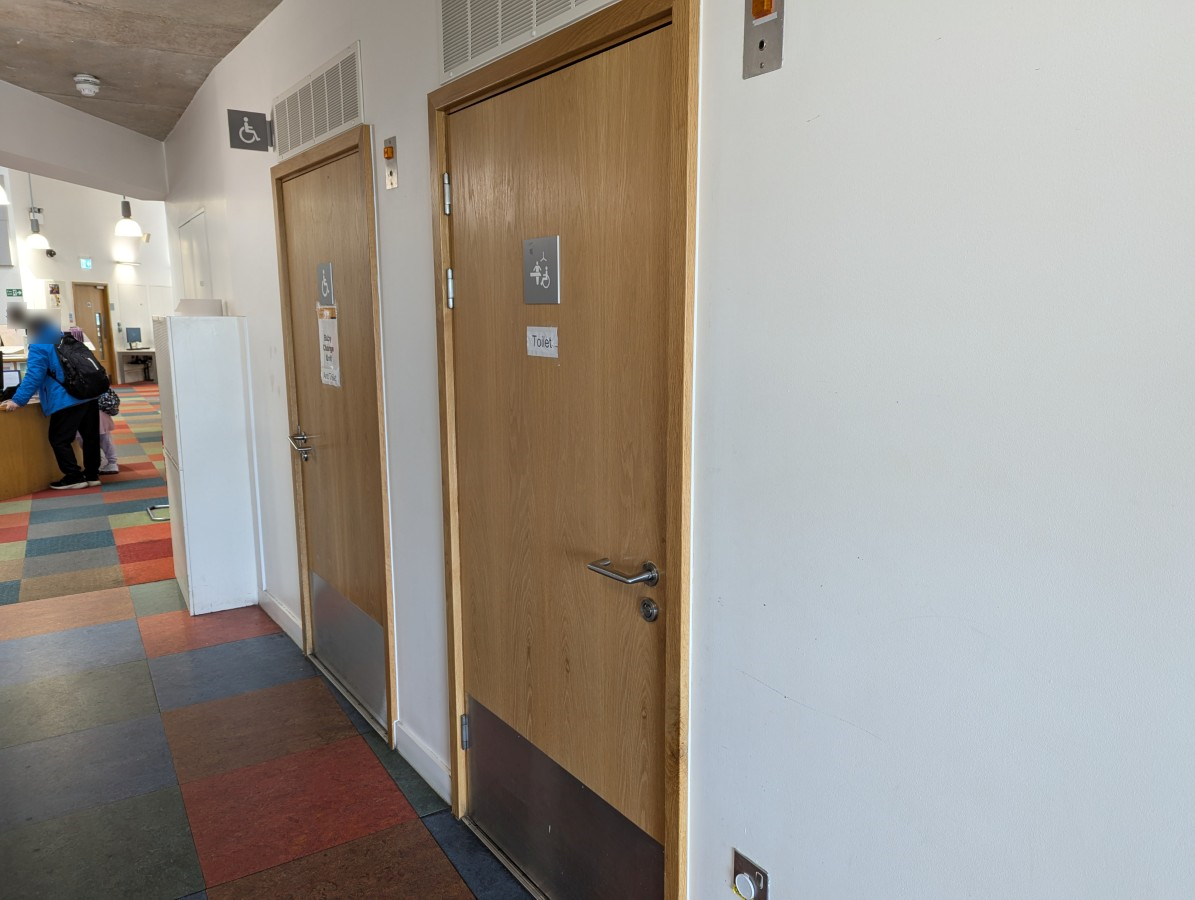 - Toilets with adaptations are located on the ground floor to the right after Revive Café and on floor 1 to the left of the lift.
