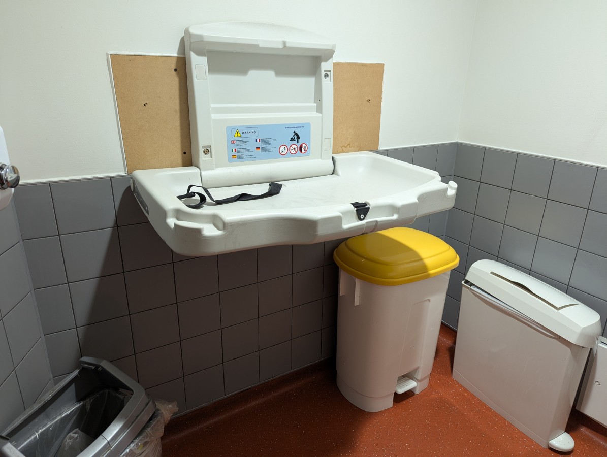 - The cubicle has a waste bin, a nappy/incontinence items bin and a sanitary bin.