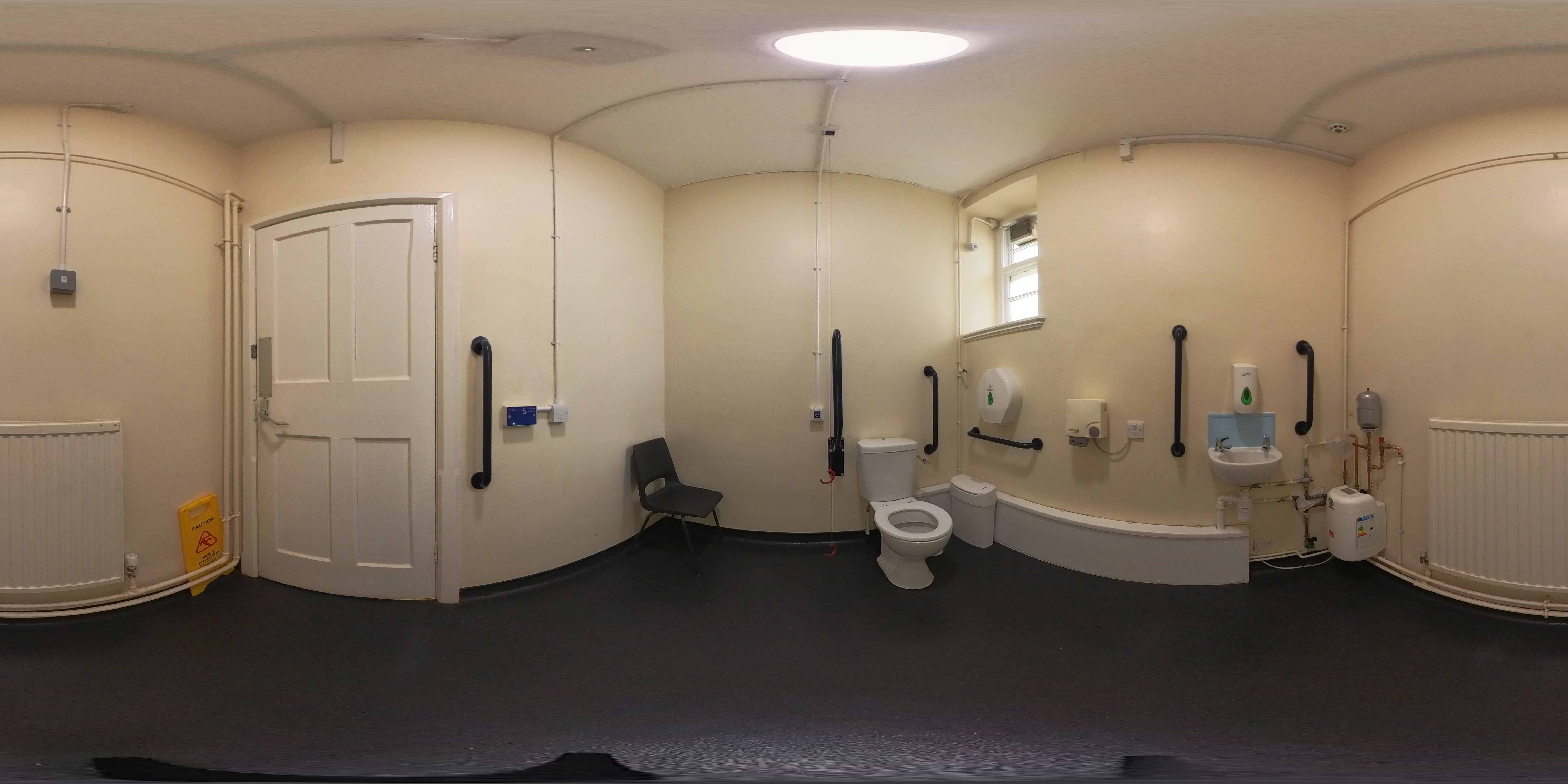 - The most accessible route to the toilet has step-free level access and manual doors.