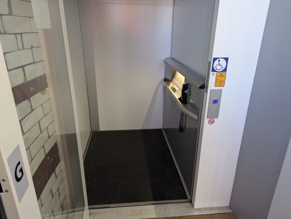 - The lift does not have a level manoeuvring space in front of it for a wheelchair user (150cm x 150cm).