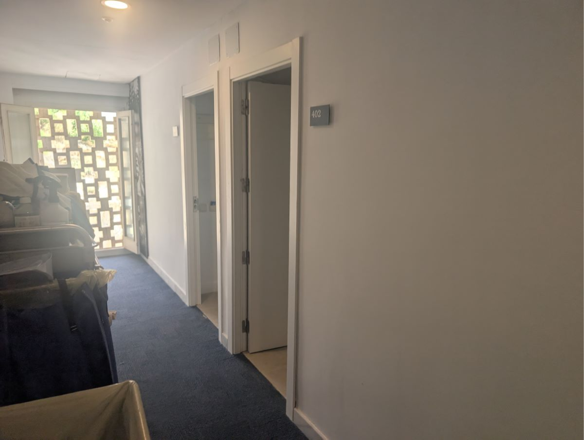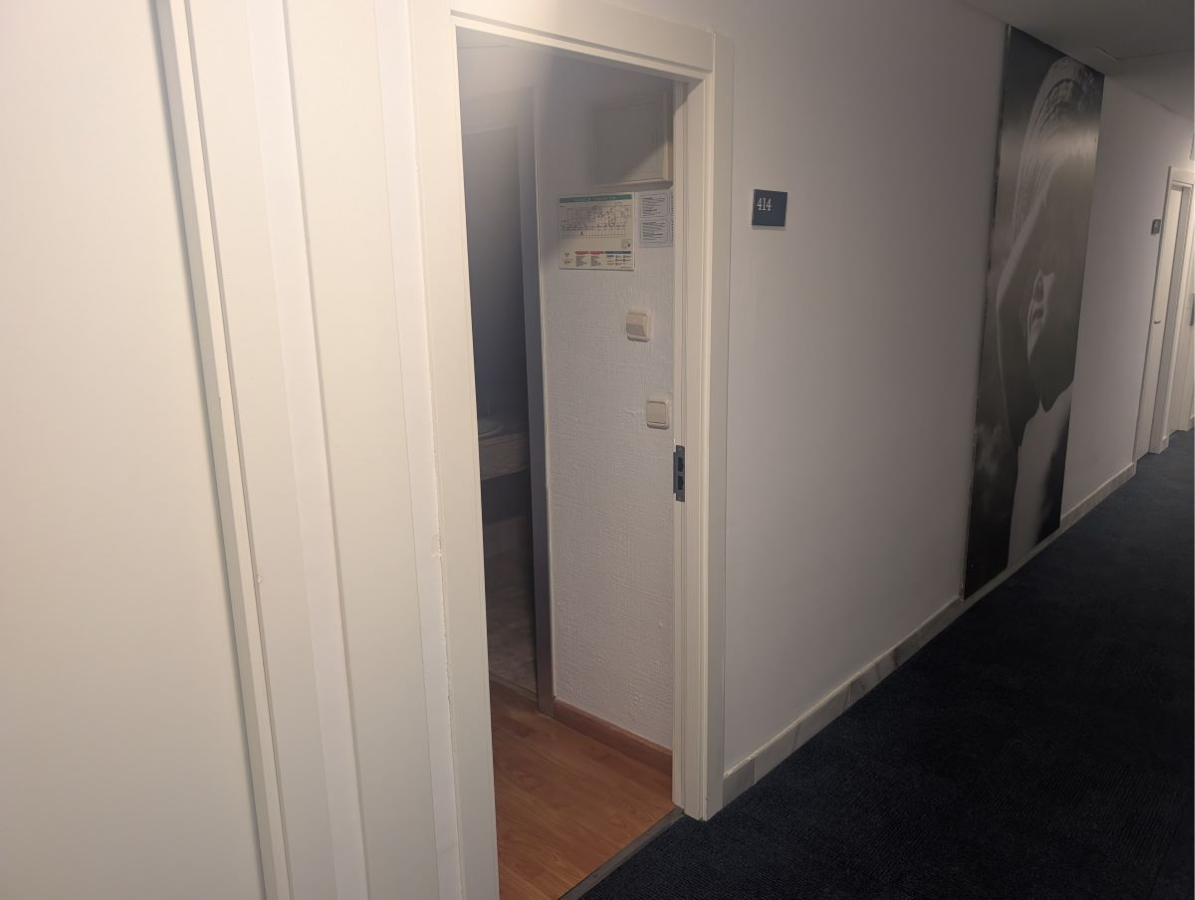 Take another left turn into the room corridor and the door to room 402 is on the right hand side. - The most accessible route to the room has a standard lift, a manual door and doors permanently held open.